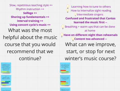 For the open card sort, I entered the data from Google Sheets into individual sticky notes, I placed the sticky note under the relevant question headers. I placed text above the headers regarding the content (or theme) of the stickies, and bolded the text if I received another comment expressing something similar. I also made note of ideas expressed by singers, by tagging the stickies with a lightbulb emoji, and replicating that emoji next to the text above the question header which captured their idea. This allowed me to track suggestions that our singers had for changing aspects of our choir operations, and quickly find their specific wording so that I could share it with leadership.