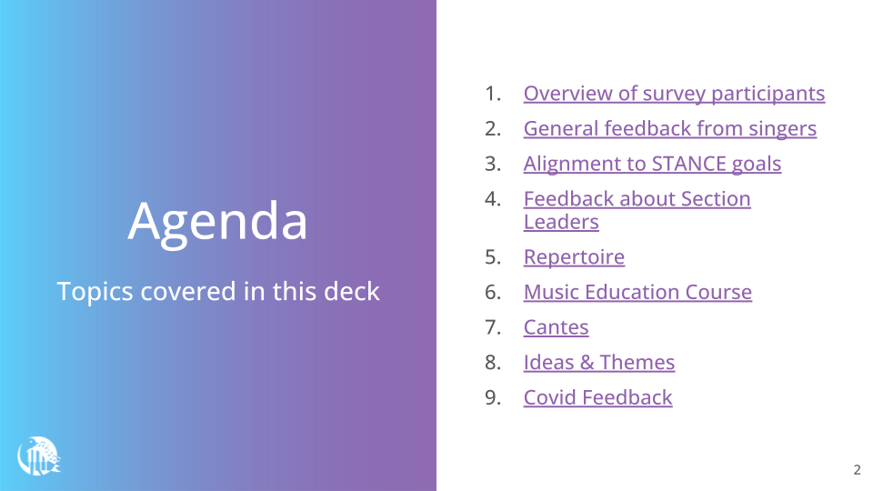 I created the final presentation of singer feedback using Google Slides, and presented it first to the STANCE Board of Directors, and then to the singers a few days later at the Annual Meeting. I have also created a slide deck for the staff performance feedback, though I am not sharing that publicly. The slide template is one that I put together for STANCE as part of the branding work that I have done for them in the past two years.